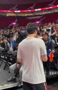 宠粉时刻!杨瀚森赛前送球鞋给身穿勇士球衣小球迷